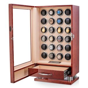 With 24 rotors and a large storage compartment, you'll be able to keep your entire collection in one place. The watch winder needs as little as 17" x 11" on your desk or dresser.
